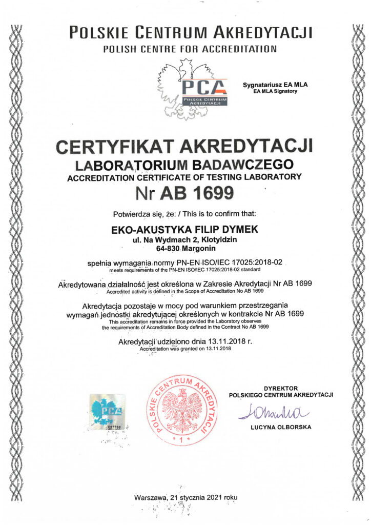 Certyfikat Akredytacji Laboratorium Badawczego nr AB1699